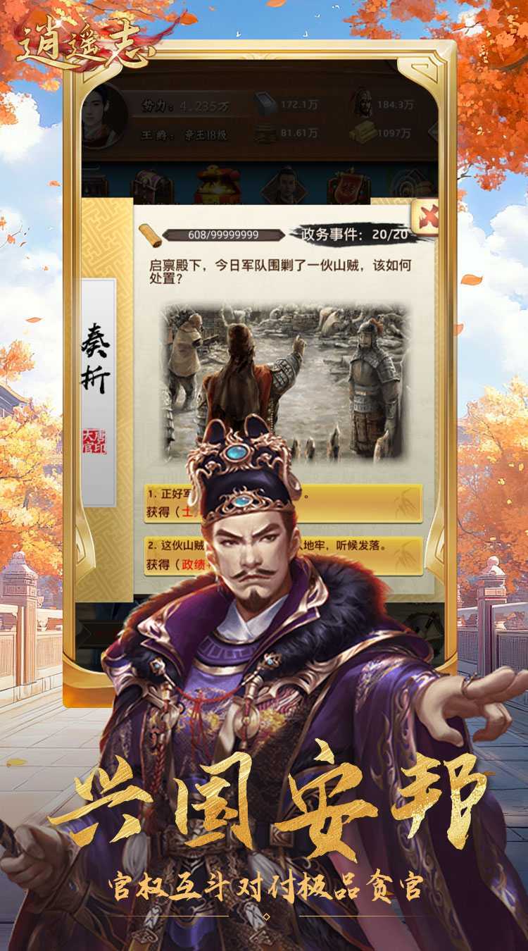 这是一款角色扮演游戏,以古代帝王之路为主题,让玩家体验称帝之路,在游戏内巧断政务、招揽门客、邂逅古代佳丽以及各种丰富的养成玩法。从贫困书生寒窗苦读到步入仕途,一步步成为当朝大官!