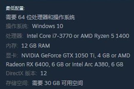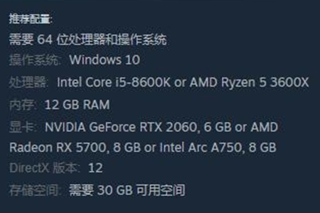 显卡: NVIDIA GeForce RTX 2060, 6 GB or AMD Radeon RX 5700, 8 GB or Intel Arc A750, 8 GB