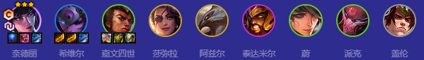 奈德丽+希维尔+嘉文四世+莎弥拉+阿兹尔+泰达米尔+蔚+派克+盖伦