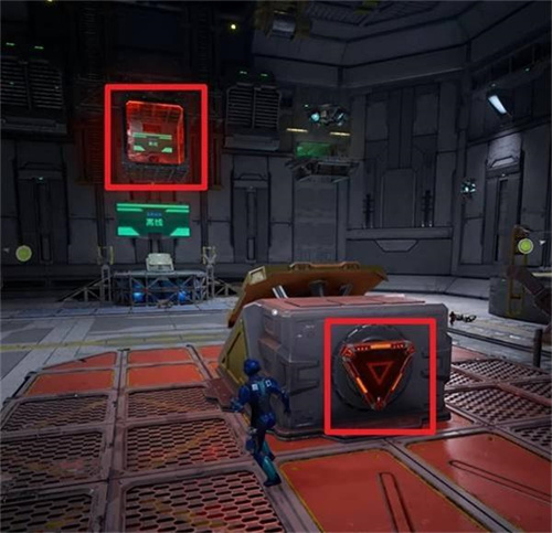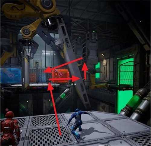 先让蓝玩家站到红色站台的弹簧机关处,然后红玩家先朝对面高处的红色激光处扔一个爆破器,再射击机关的红色标志让蓝色玩家往对面高处平台跳。