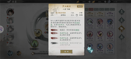 心法不用多说就是回血,配合罗汉棍法10重和慈悲棍法10重,可以使你每回合恢复大量血量。