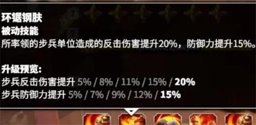 1、步兵反击伤害提升5%/8%/11%/15%/20%