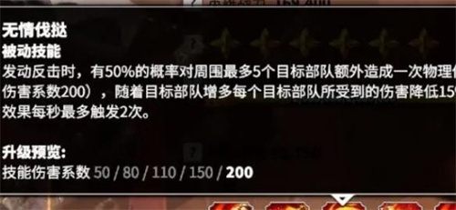 发动反击时,有50%的概率对周围最多5个目标部队额外造成一次物理伤害(伤害系数200),随着目标部队增多每个目标部队所受到的伤害降低15%,该效果每秒最多触发2次。