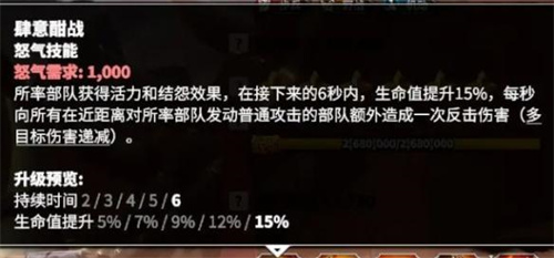 2、所率部队获得活力和结怨效果,在接下来的6秒内,生命值提升15%,每秒向所有在近距离对所率部队发动普通攻击的部队额外造成一次反击伤害(多目标伤害递减)。
