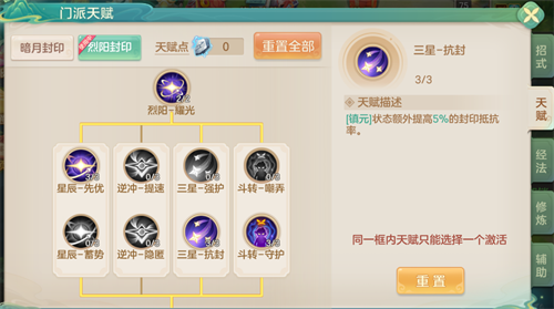三星镇元(核心):有概率使敌人陷入“招式封印”一定回合,并且自身获得“镇元”效果。镇元效果下物防和法防提高。在烈阳系天赋加成下还会有一定的抗封能力,完美适配2速封的需求。