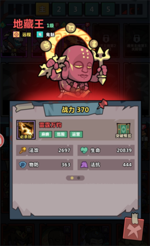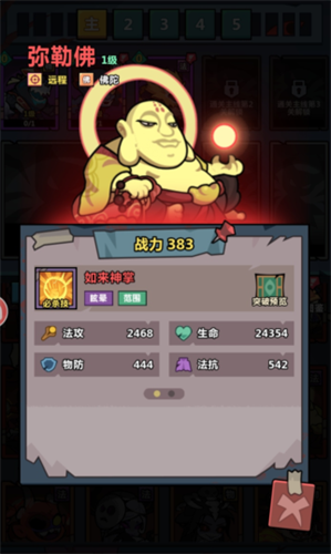 如果感觉这两个输出角色不够的话,就可以搭配三足金乌,这是一个可以进行远程群体攻击的角色,并且角色的获取也非常简单,只要完成主线任务,就可以直接获得,后期通过能力不断提升还能得到额外的aoe能力,但是只有这些输出角色是远远不够的,想让队伍有更优秀的表现,还需要选择几个控制角色,玩家可以选择弥勒佛,这是一个带有眩晕能力的控制角色,在对战的过程中可以触发眩晕效果,借助这个效果可以让队伍的其他成员不断增加伤害。