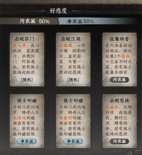 加入丐帮过后便会解锁丐帮专属的门派贡献商店,和丐帮的悬赏榜单。此时你已经成为了一个丐帮的外门弟子,想要从外门弟子晋升到内门弟子那么就需要25点的触发好感。玩家可以来到丐帮总管华不清这里,接取丐帮的任务悬赏,每一轮都可以增加3~5点的触发好感,小伙伴们多完成几个任务就可以达到25了。此时你会收到蓉儿的飞鸽传书,按照任务帮助蓉儿调理纷争或者以德服人,用口才说赢对方或者战胜对方,后续回复蓉儿,你便直接晋升为内门弟子。